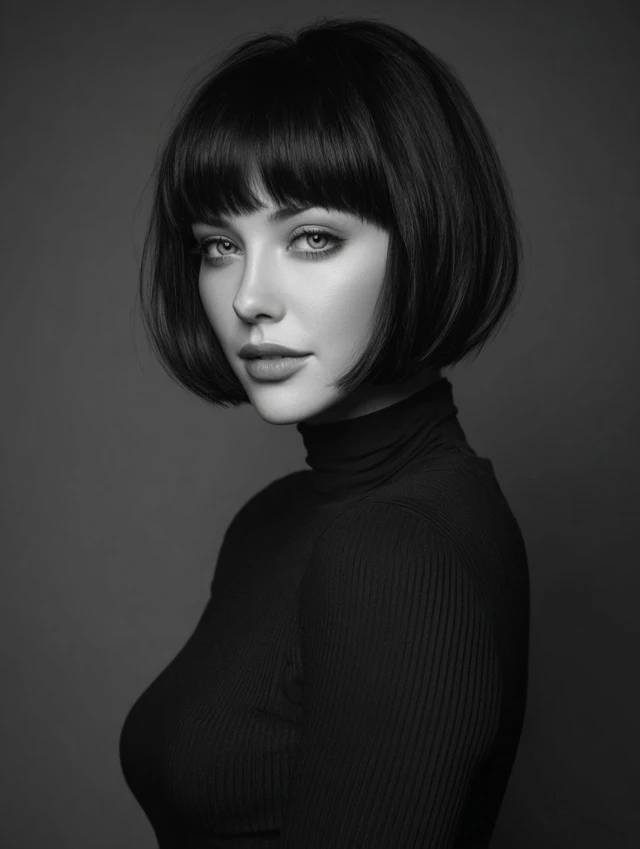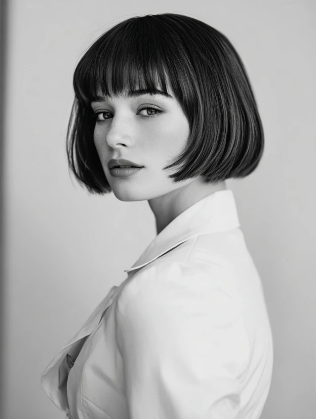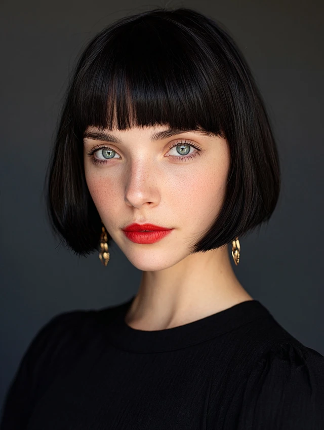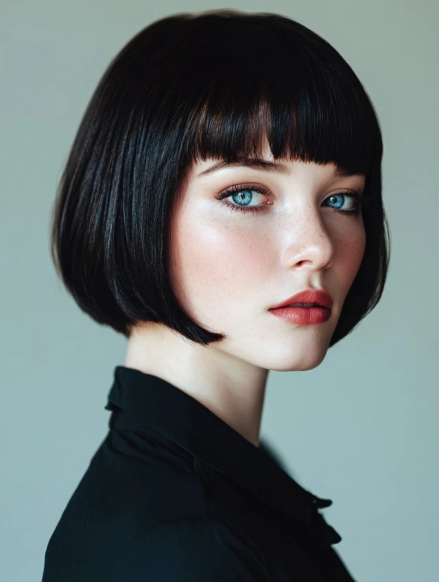 Why it works: Blunt bangs add structure and frame the face elegantly.