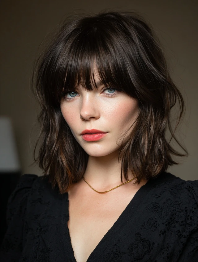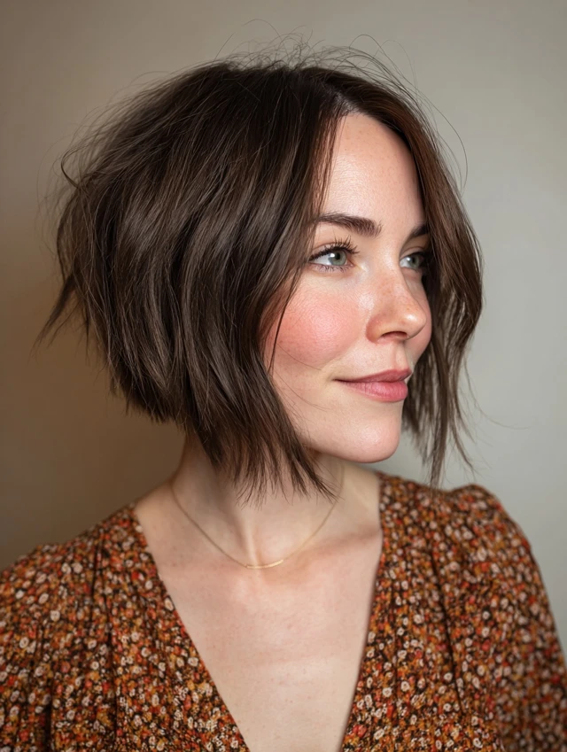 Why it works: Angled bob enhances jawline while curtain bangs soften the forehead.