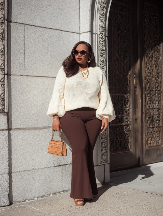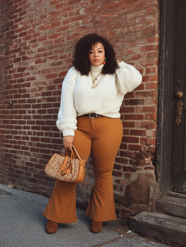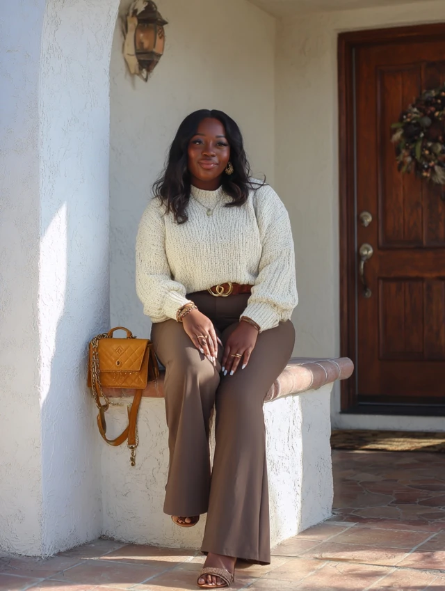 2. Brown Flared Jeans + Cream Sweater