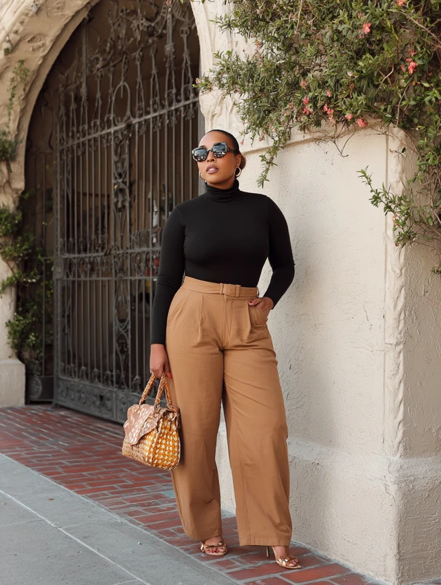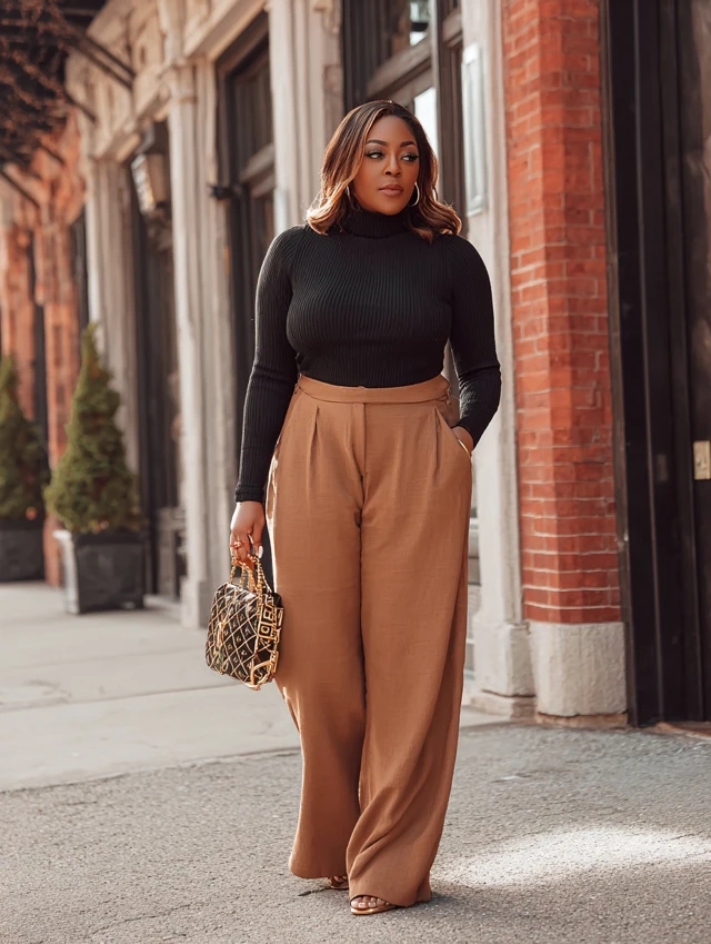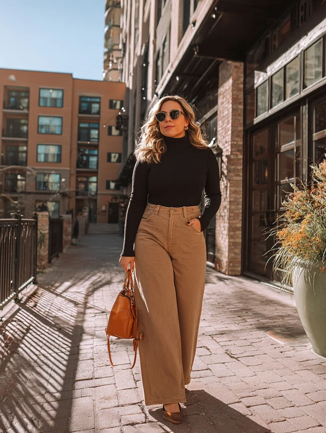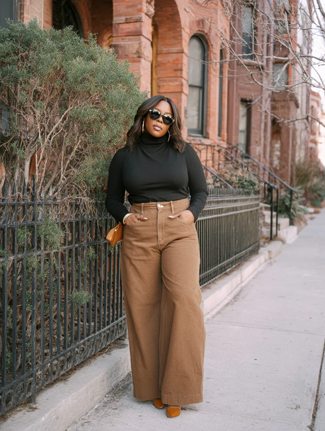 3. Brown Wide-Leg Jeans + Black Turtleneck
