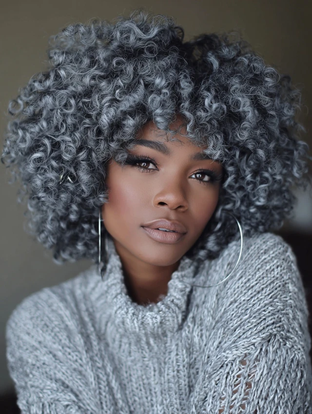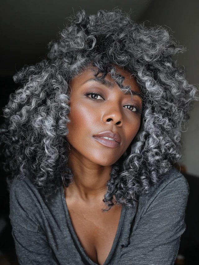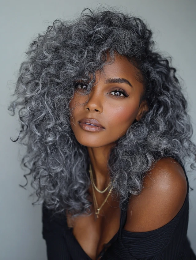 Ash grey enhances texture beautifully, giving curls a smoky, dimensional glow. It’s soft, chic, and effortlessly stylish.