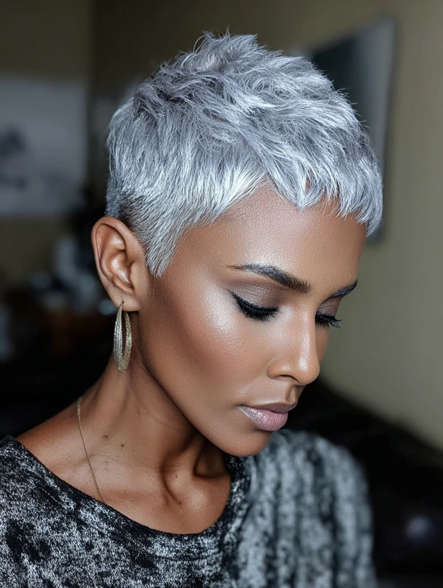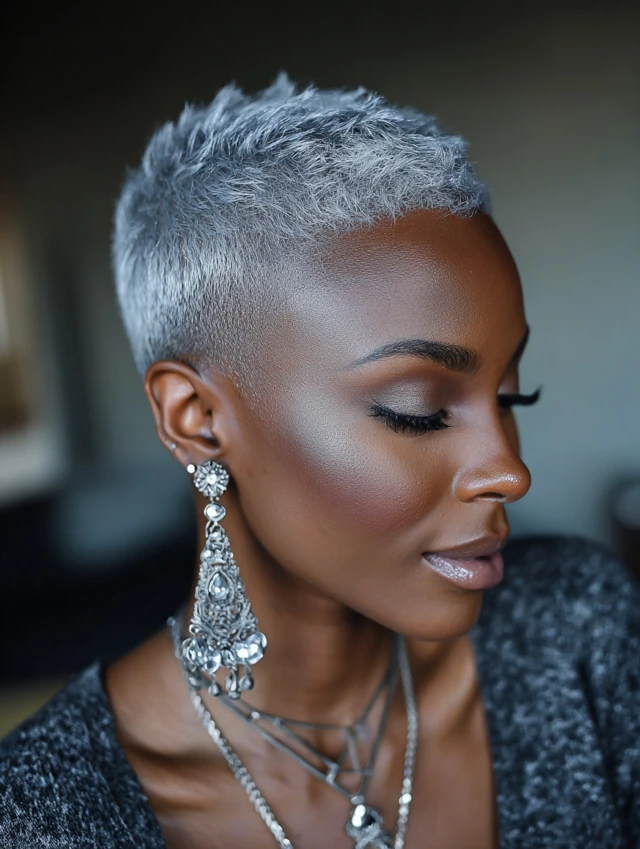 Short hair paired with icy tones gives a chic, futuristic feel. The high contrast against dark skin looks sharp and confident.