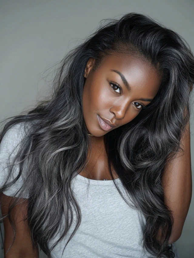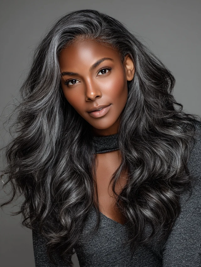 Grey hair creates a unique balance: cool tones + rich complexion + strong contrast. Here’s why it’s perfect: