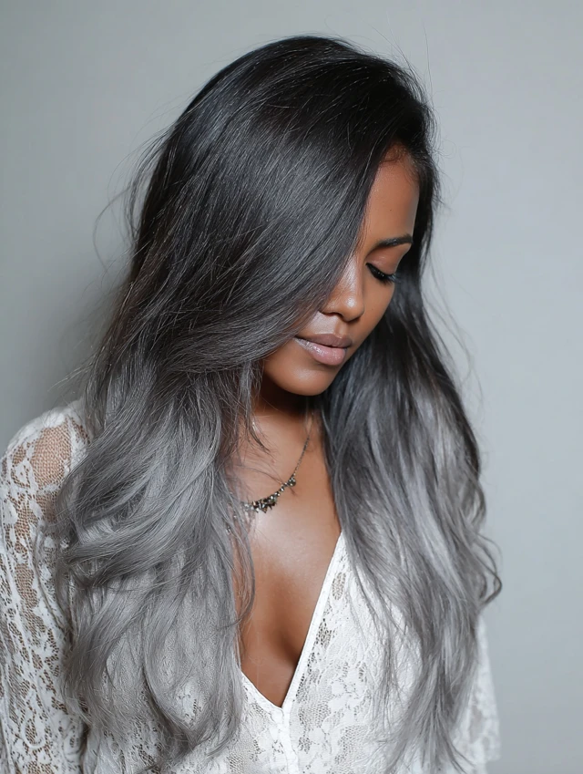 Dark roots fading into silver ends create a high-contrast look that feels edgy but wearable. It’s modern, blended, and photogenic.