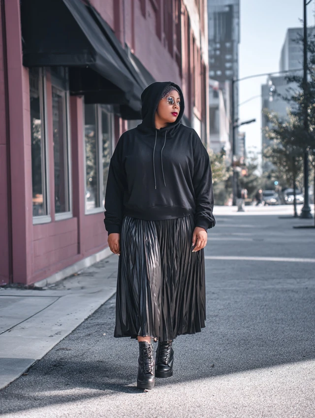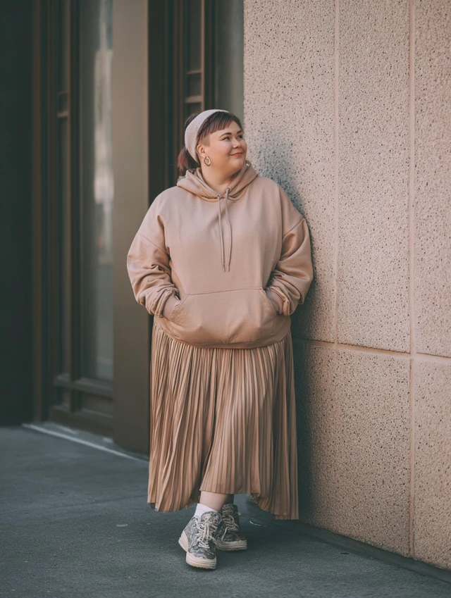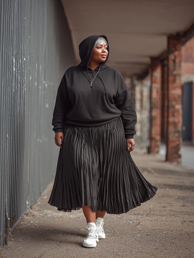Why It Works: The oversized hoodie adds comfort, while the skirt keeps it playful.