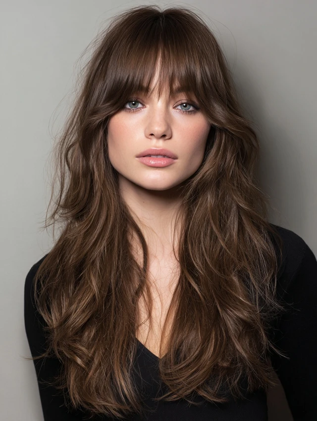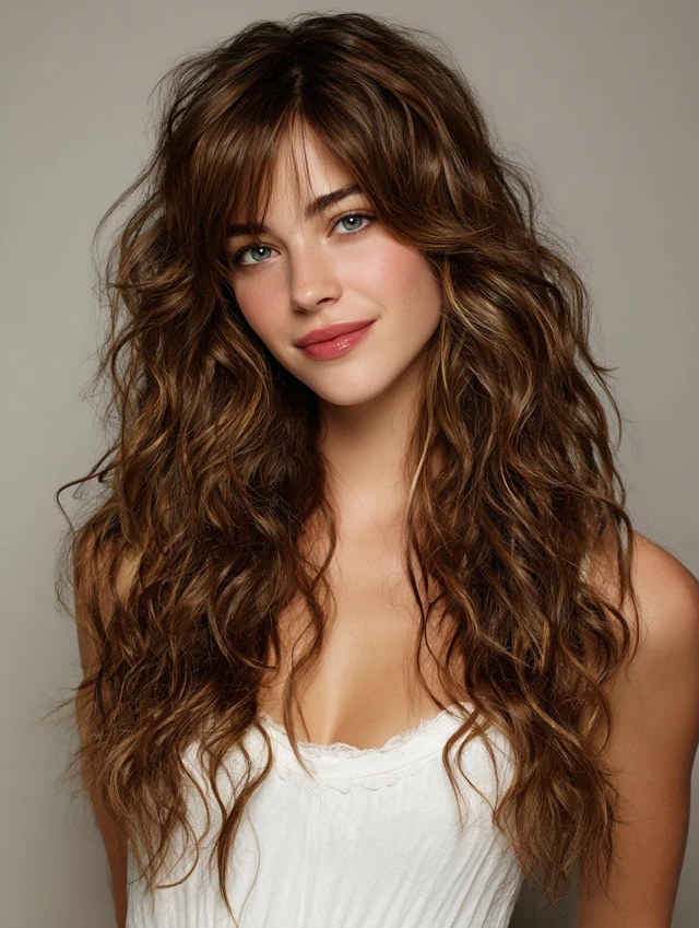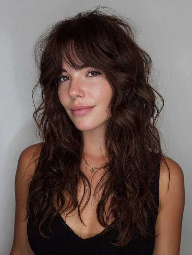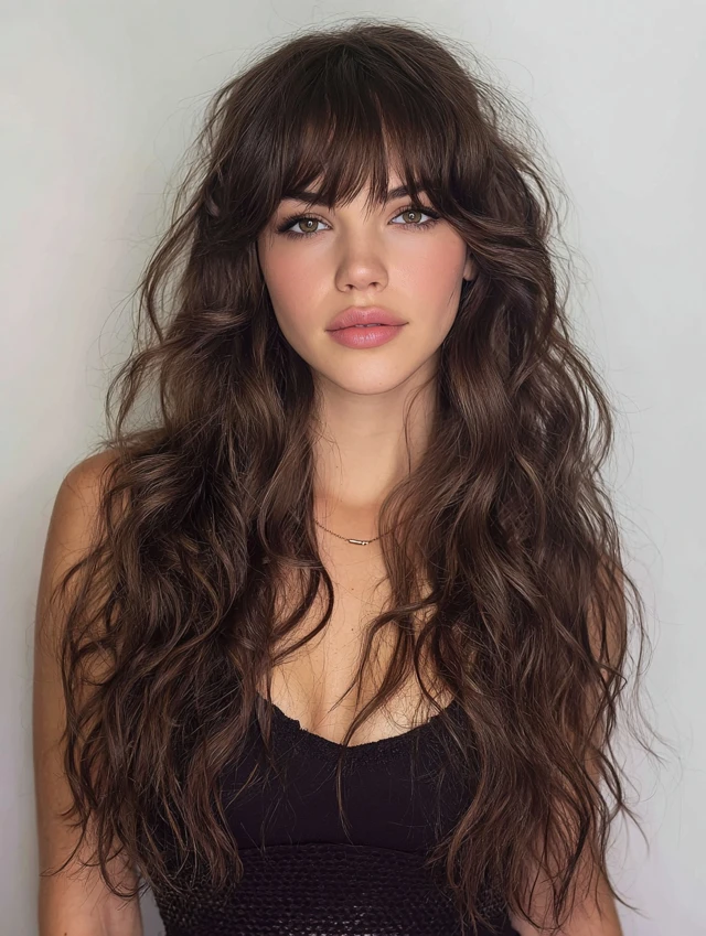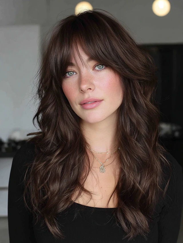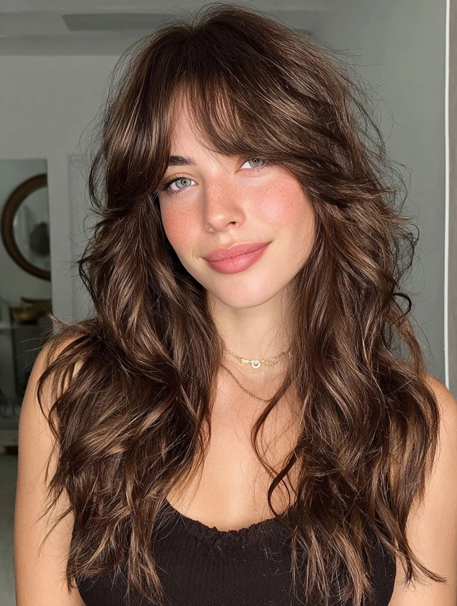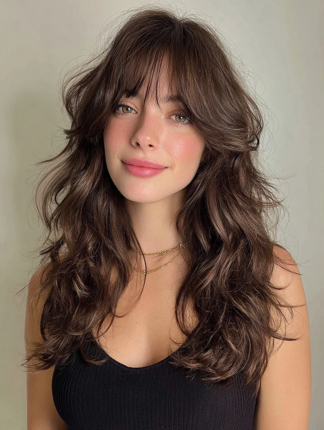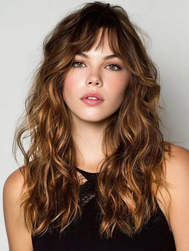 Curtain bangs soften the face while layered waves add volume and texture.