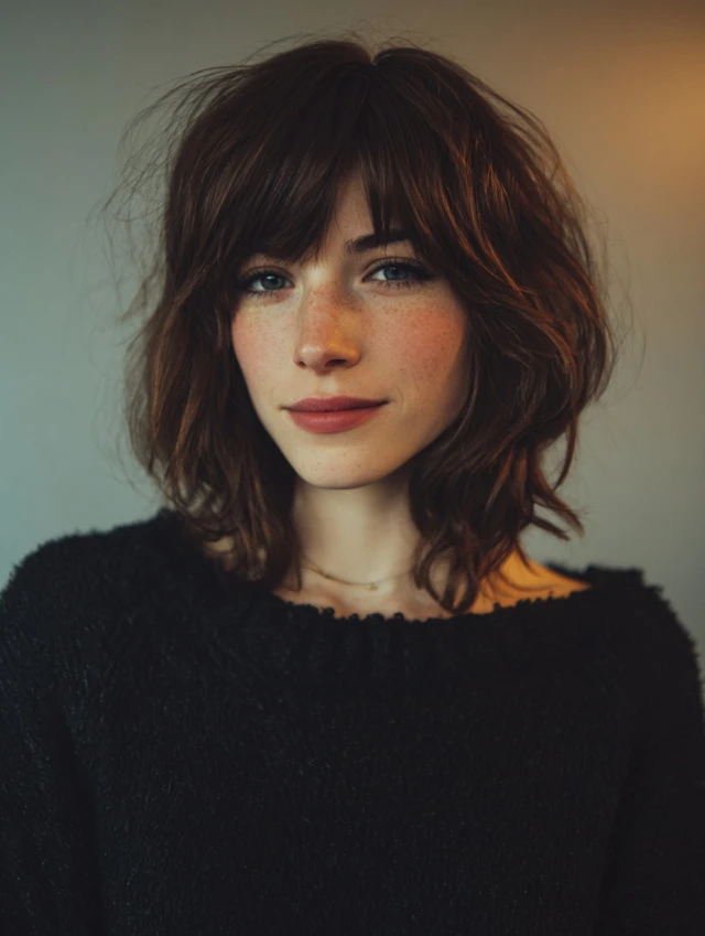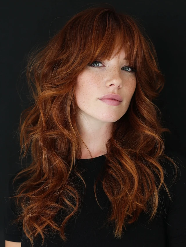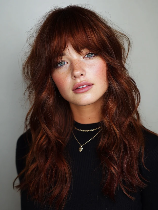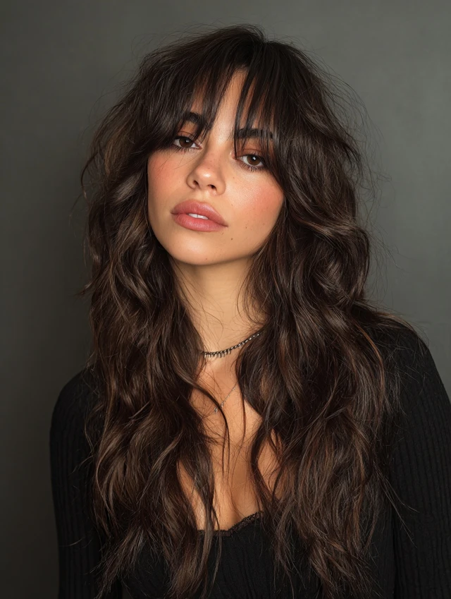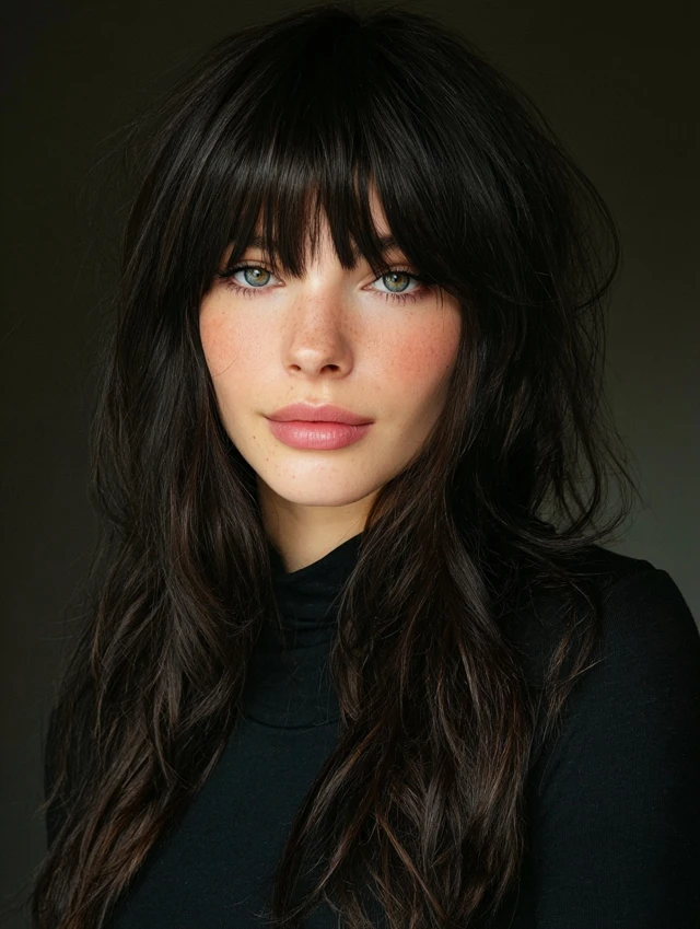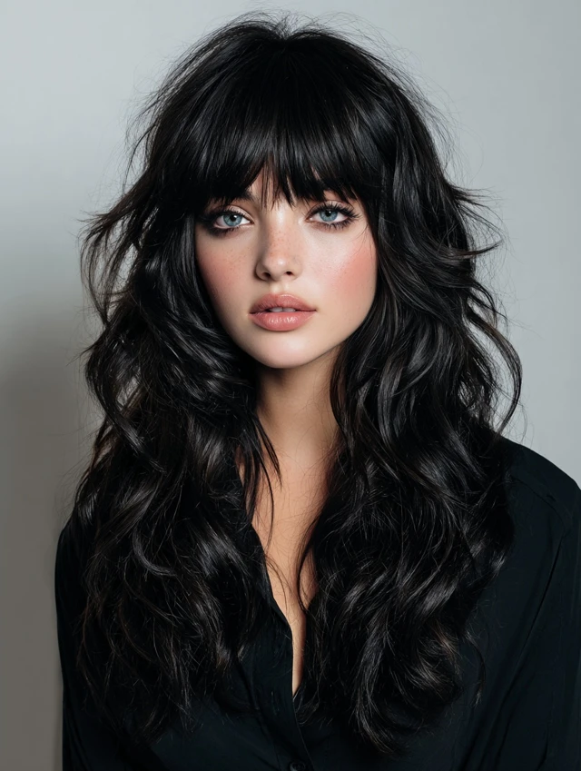 Full bangs create a striking look while layered hair adds dimension and softness.