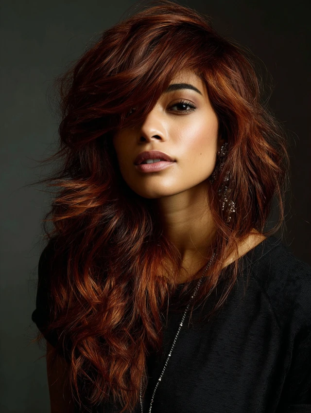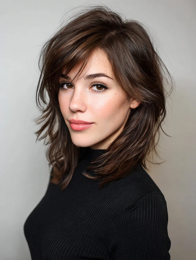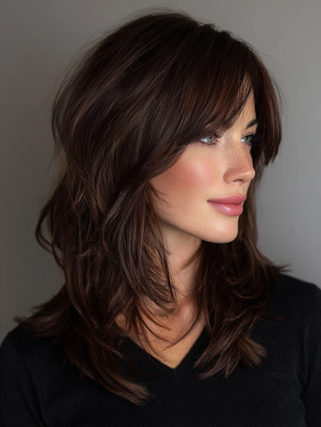 Side-swept bangs blend effortlessly with layers, adding sophistication.