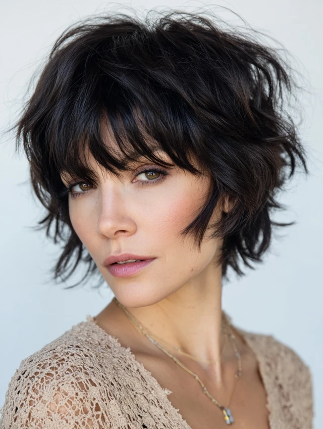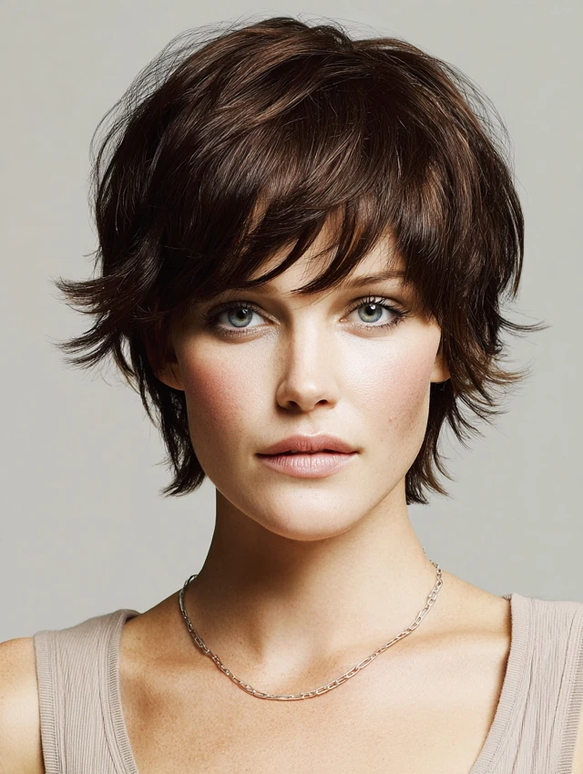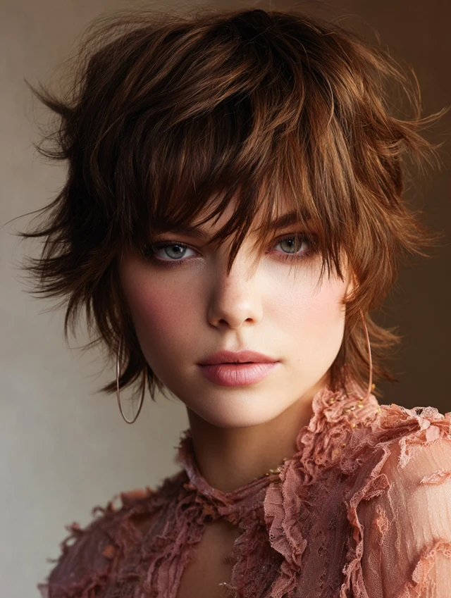 Short layers with wispy bangs create a playful, youthful appearance.