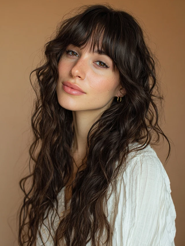 Waves enhance layered texture while bangs frame the face beautifully.