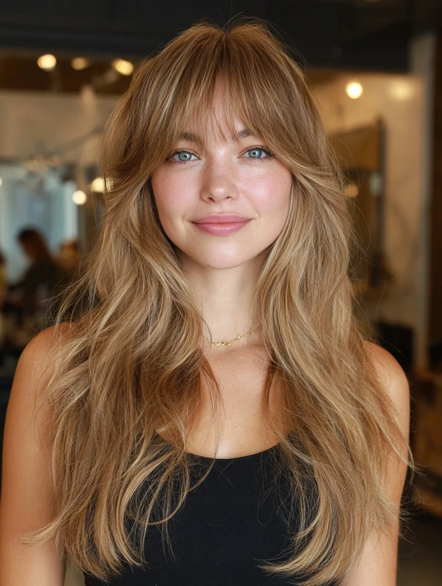 Curtain bangs soften the face and flow naturally with long layers.