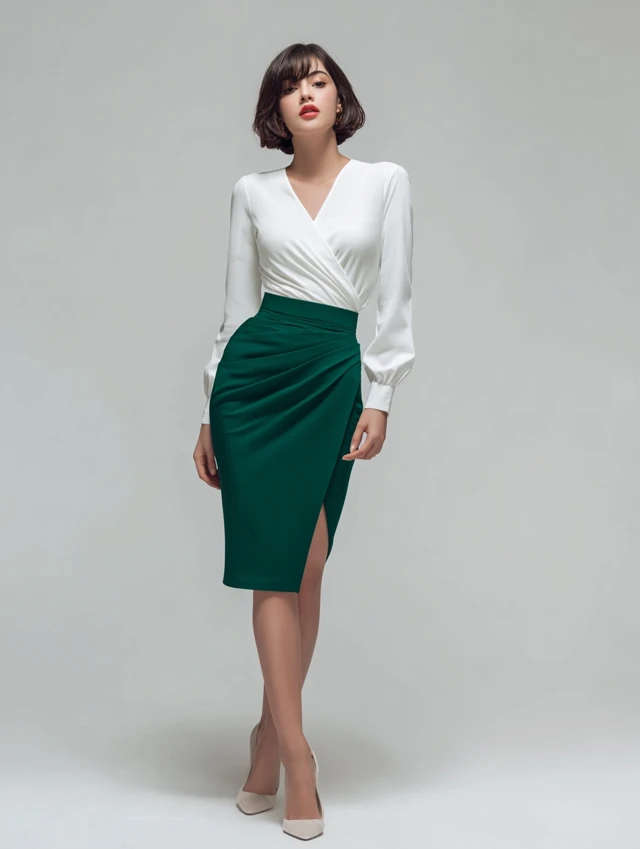 4. Wrap-Style Long Sleeve Top + Pencil Skirt
