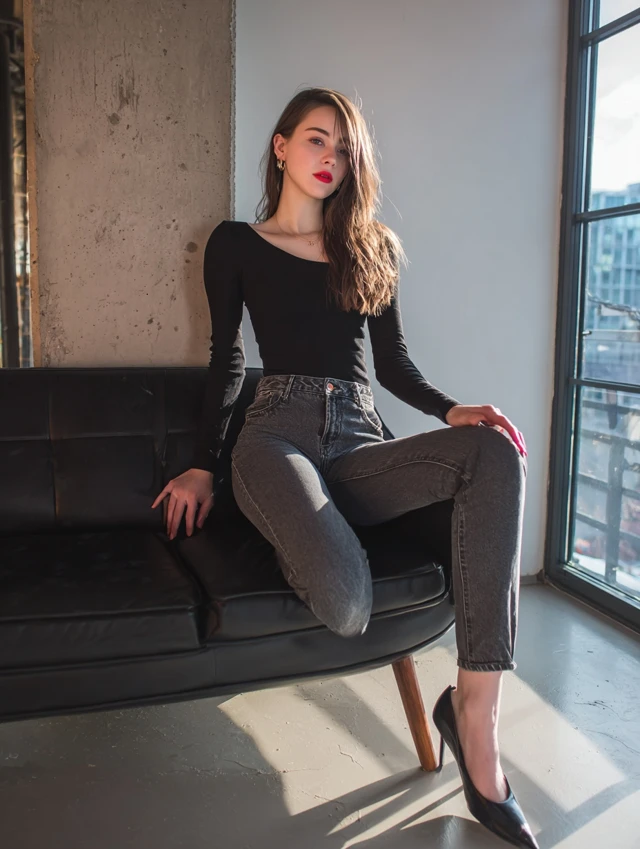 1. Long Sleeve Fitted Top + High-Waist Jeans