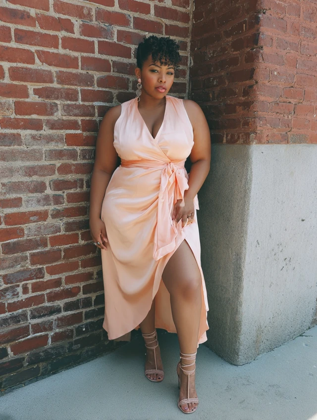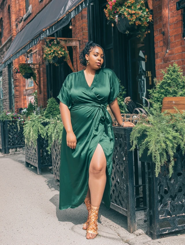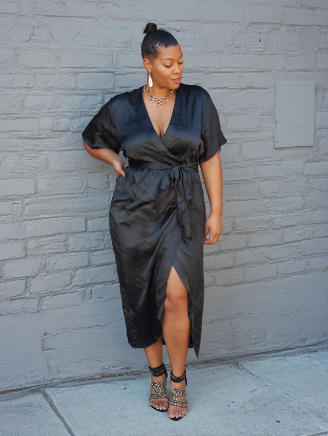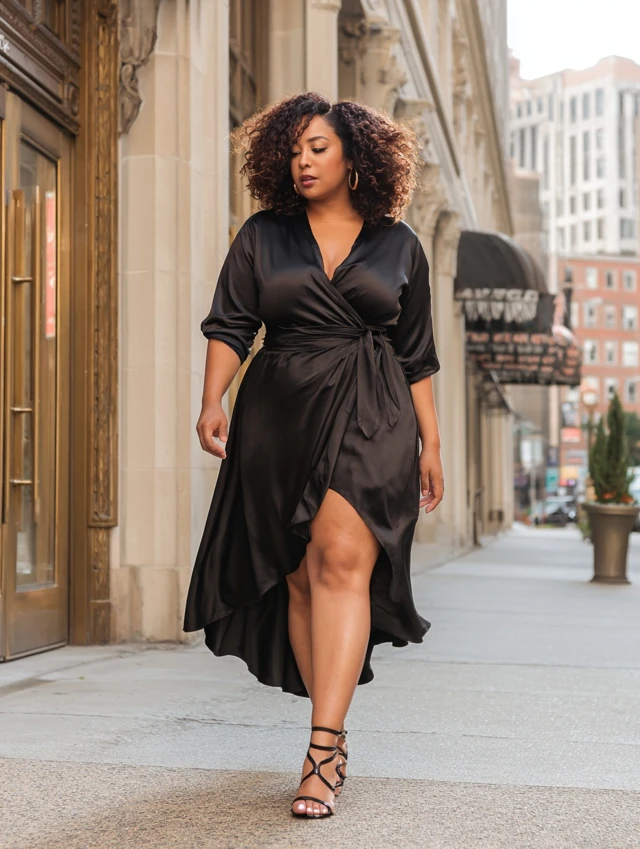 Why It Works: Wrap styles define the waist beautifully while satin adds a luxurious shine.