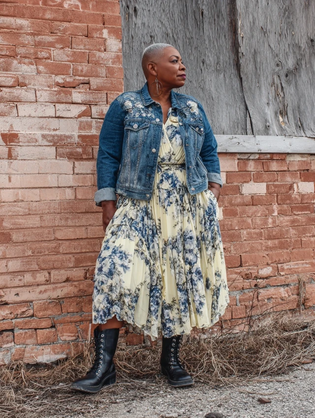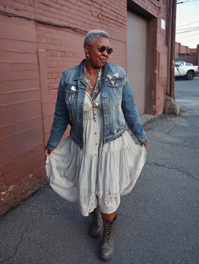 3. Denim Jacket + Flowy Dress + Combat Boots