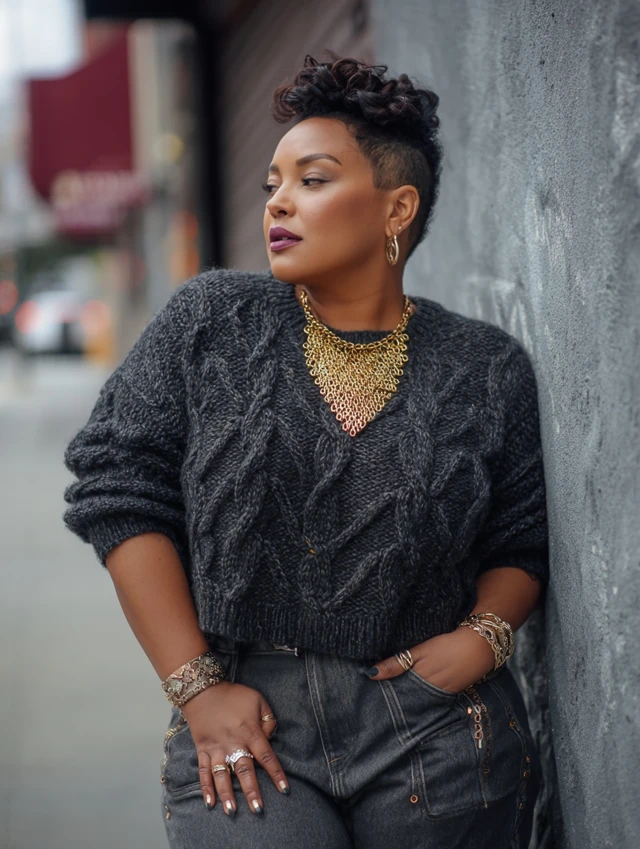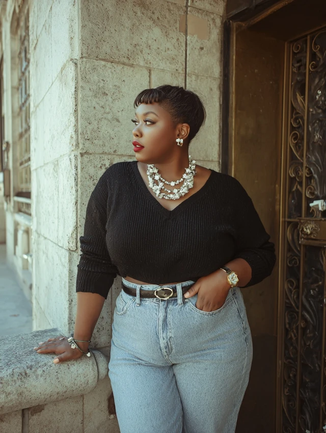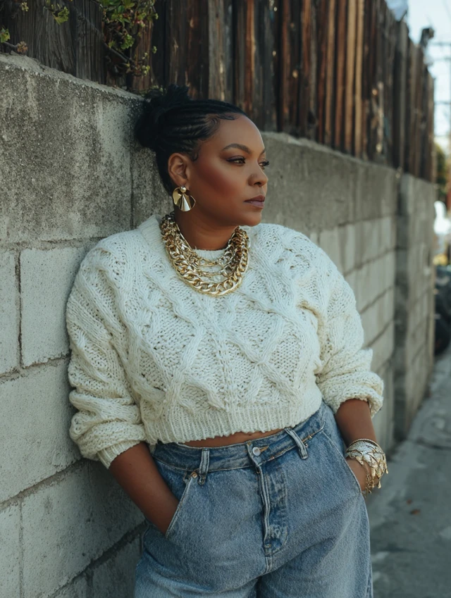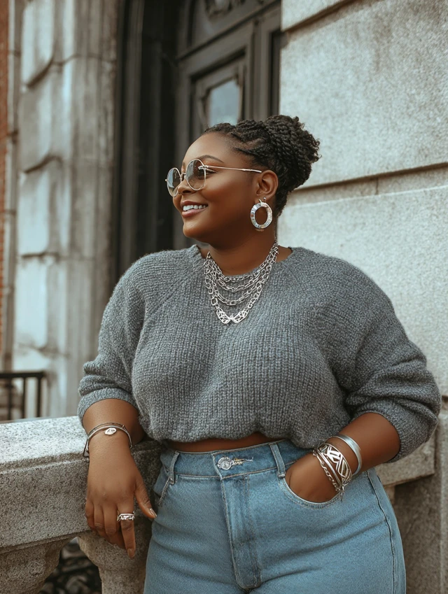 3. High-Waist Jeans + Cropped Sweater + Layered Jewelry