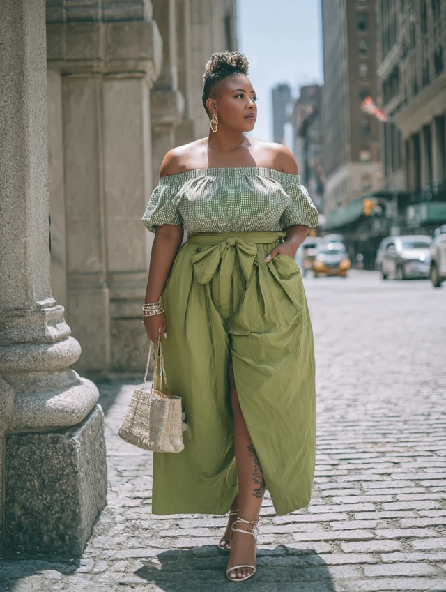 - Foundation: Flowing dress, high-waist jeans, or midi skirt.