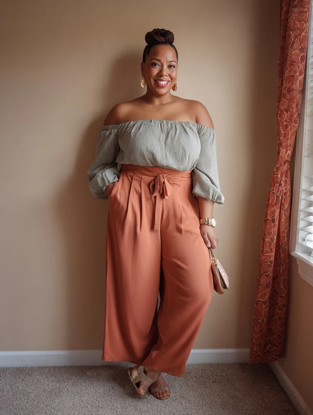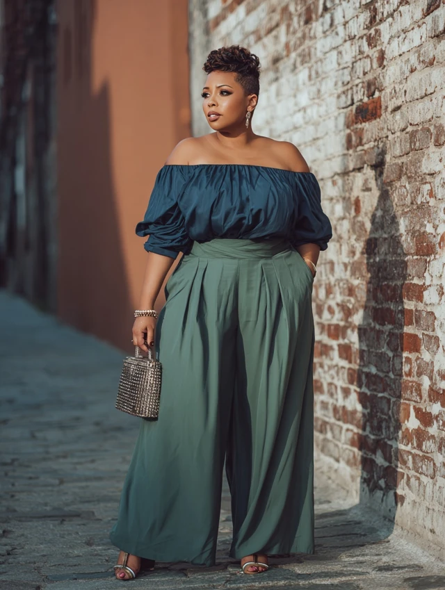 5. Wide-Leg Pants + Off-Shoulder Blouse