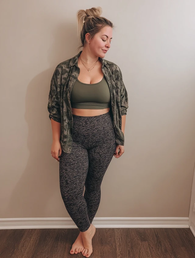 The key to yoga pant styling is creating balance and intentional layering. Here’s the go-to formula: